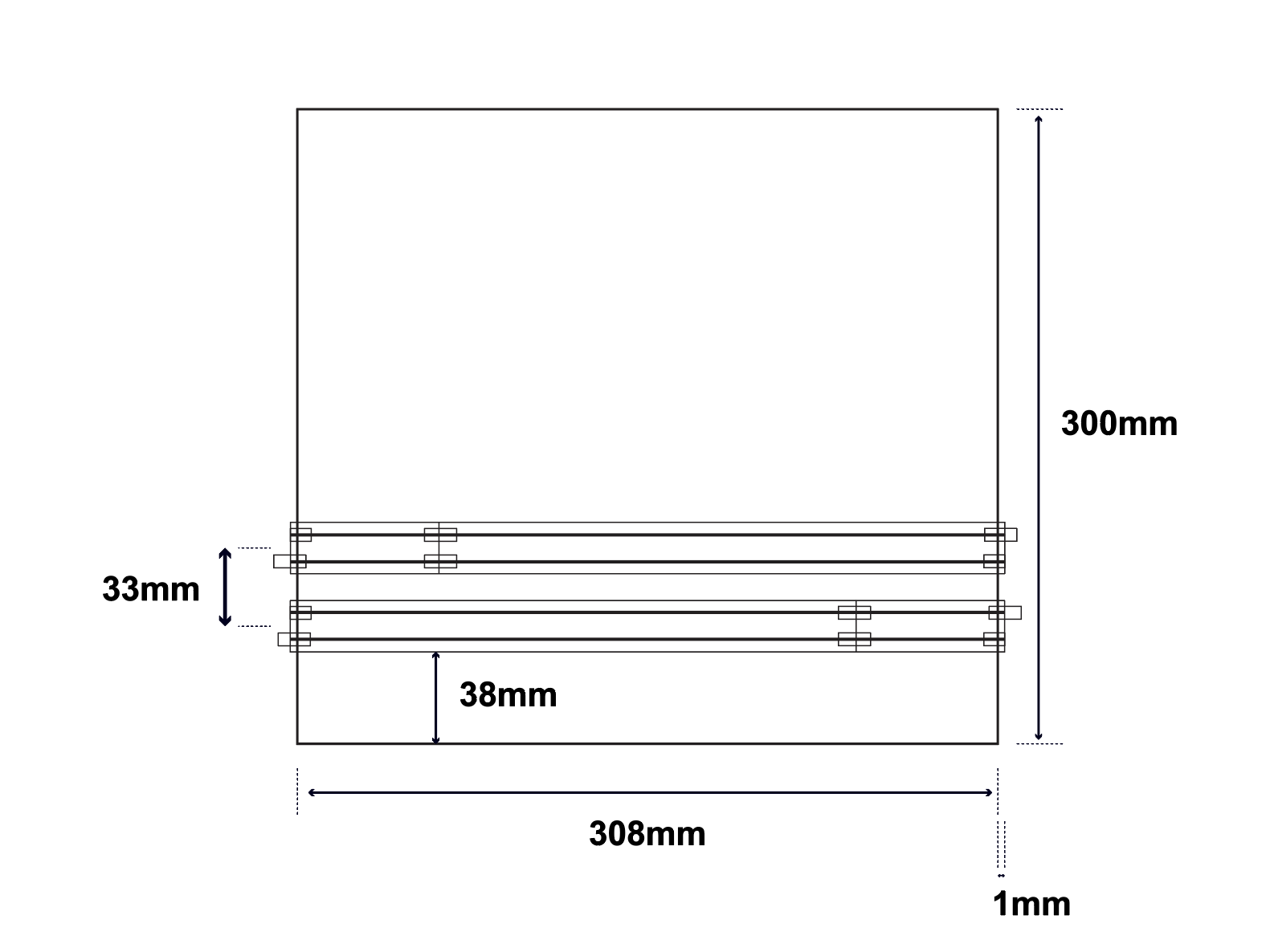 The first track is positioned with the edge of the Kato Unitrack located 38mm from the front of the module. The two mainline tracks are 33mm apart (centre to centre). The most common modules are singles (310mm long track length) and doubles (620mm long) with 90 and 180 degree corner modules.