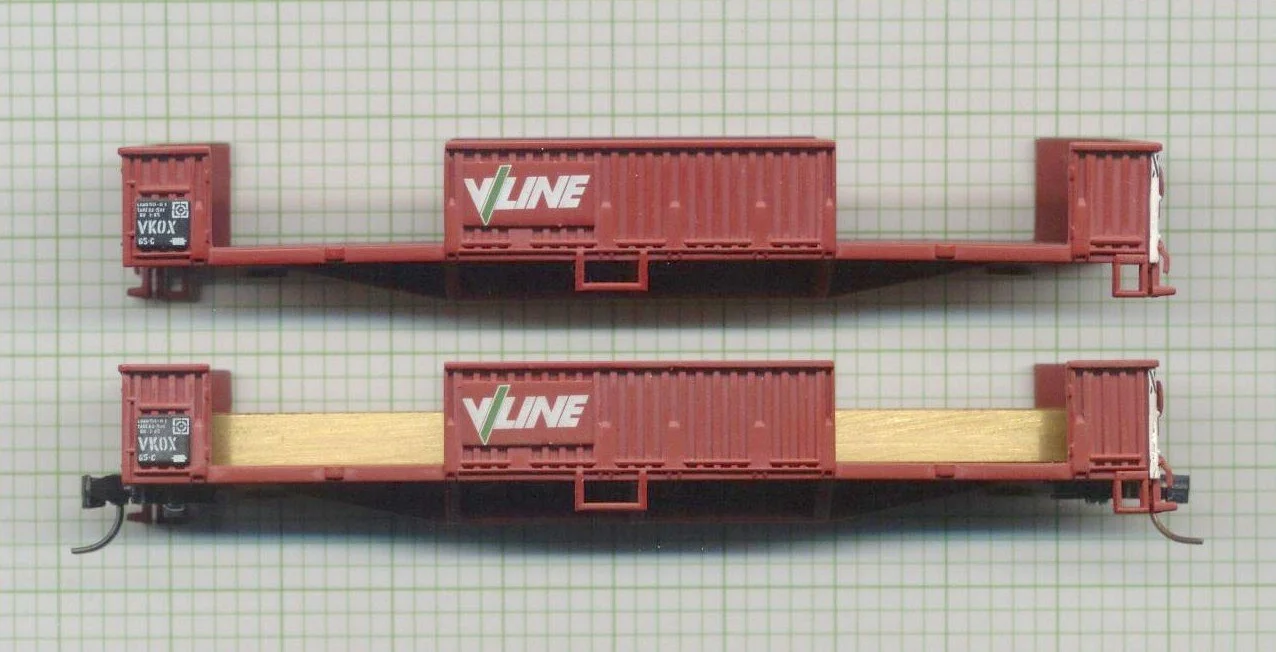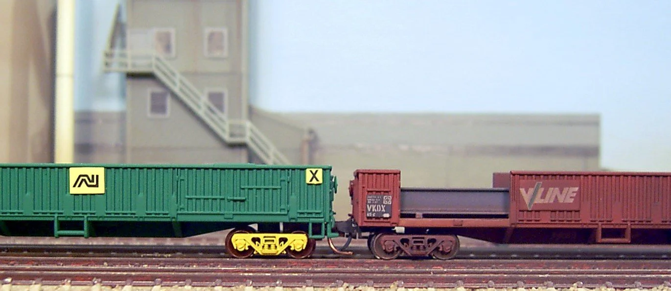The bogies, interiors and under frames of the wagons along with the VLINE name panels were scrubbed with “Burnt Umber” powdered pastel and the exteriors were randomly brushed with the same colour and sealed with Dullcote.